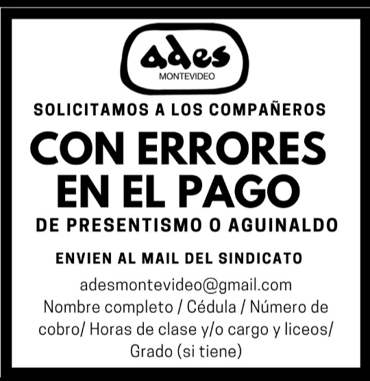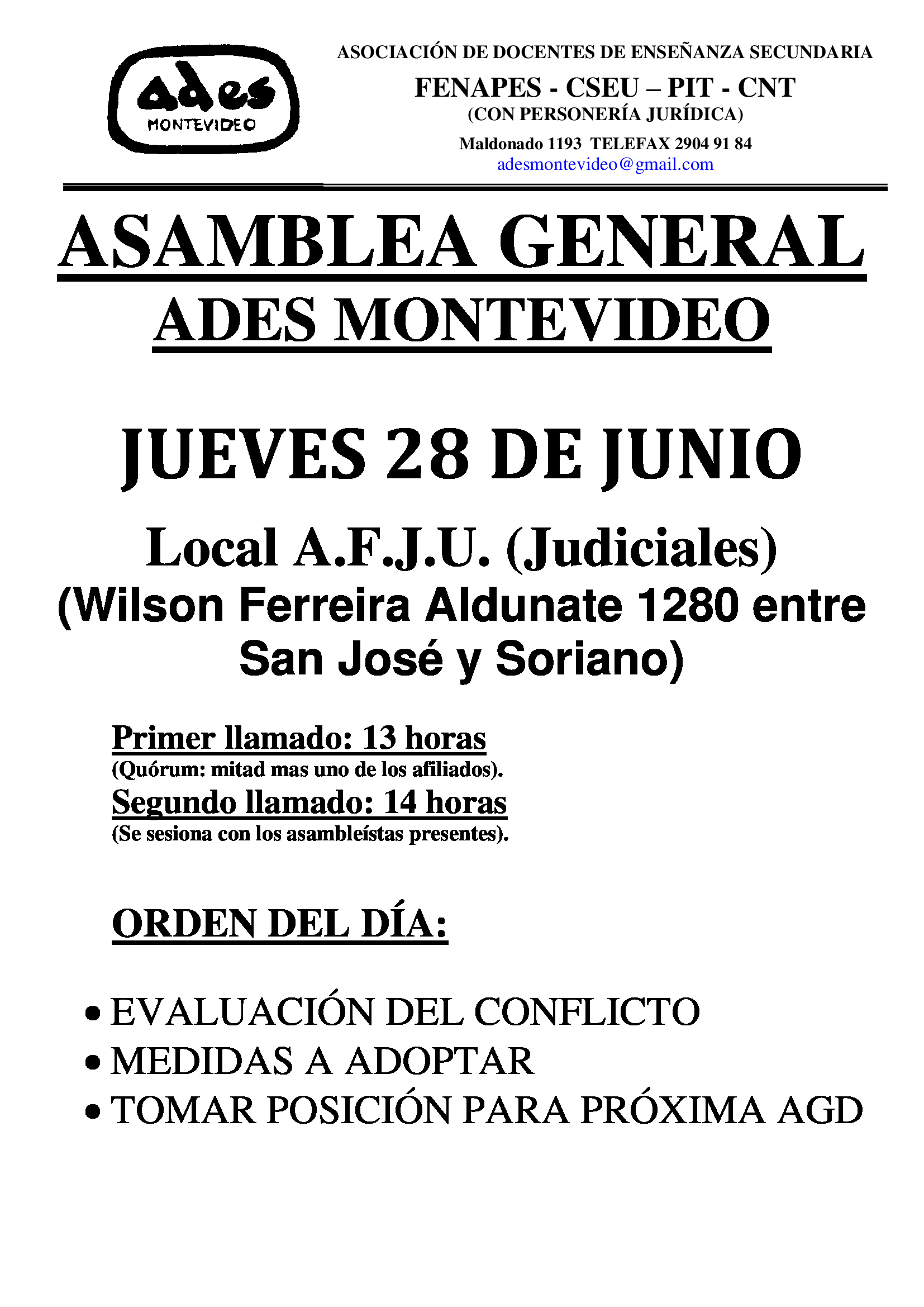 Compañeras y compañeros docentes de todos los rincones del país: La Asamblea General de ADES Montevideo, máximo órgano de discusión y decisión de nuestra filial,