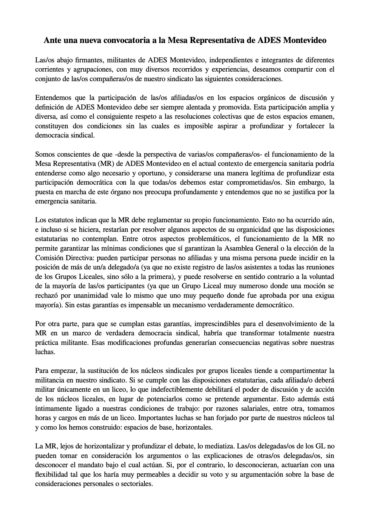 Compañeras y compañeros docentes de todos los rincones del país: La Asamblea General de ADES Montevideo, máximo órgano de discusión y decisión de nuestra filial,
