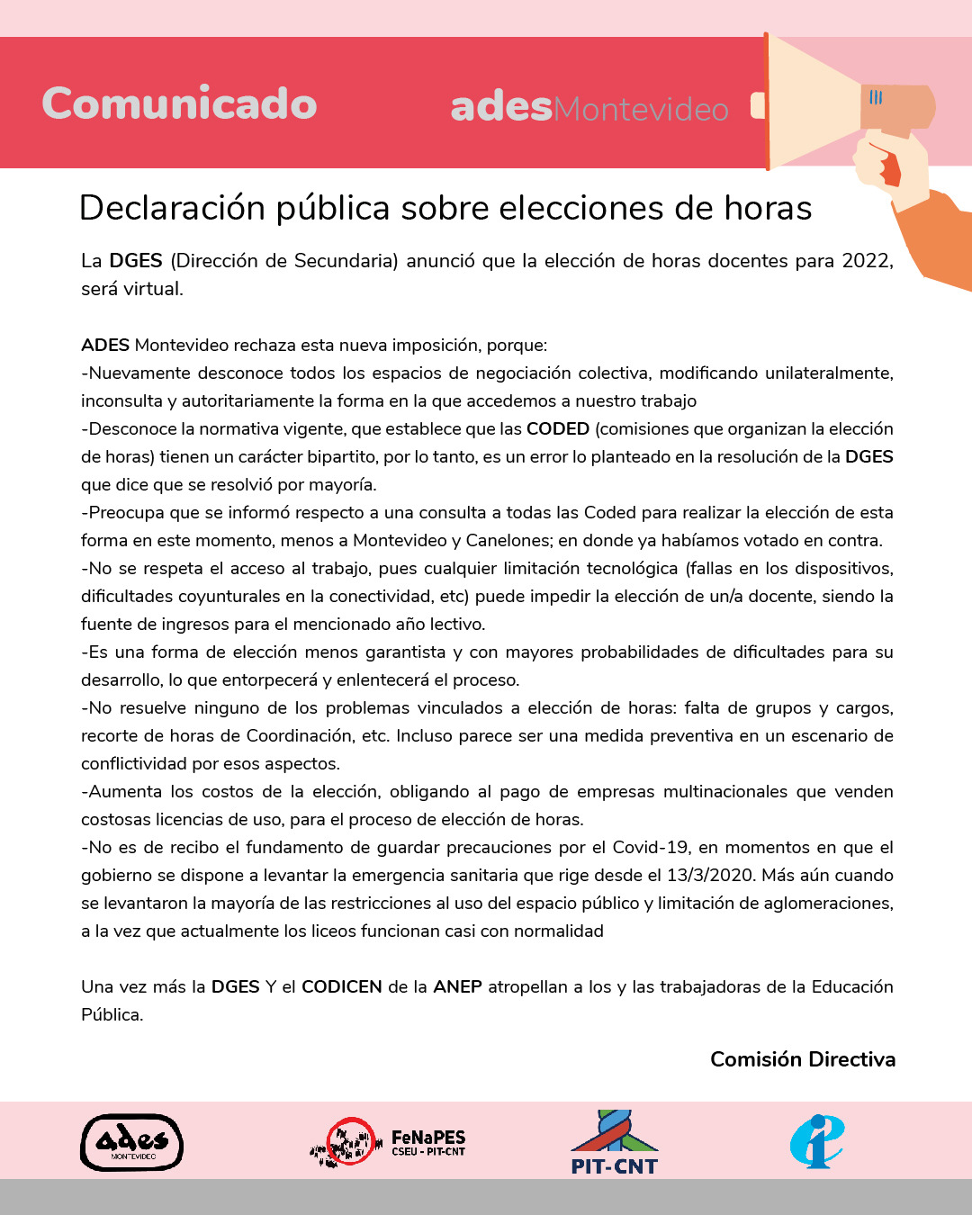 De acuerdo a lo resuelto en la Asamblea General del 6 de abril pasado, la Asociación de Docentes de Enseñanza Secundaria de Montevideo expresa: Su