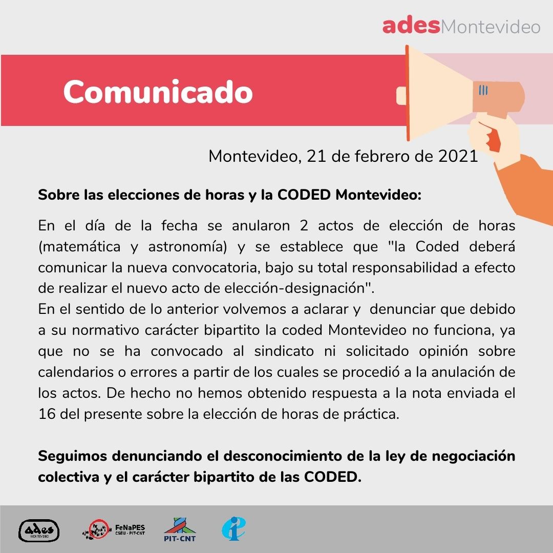Montevideo, 11 de abril de 2019 La Asamblea General de ADES Montevideo lamenta el fallo judicial en primera instancia que ha negado al compañero Profesor