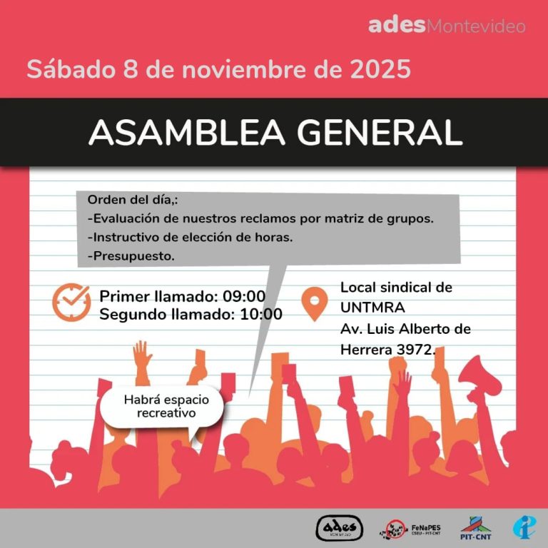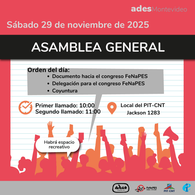 ASAMBLEA GENERAL Sábado 18 de octubre de 2025 Orden del día: -Ternas Montevideo para el congreso de FeNaPES -Informe