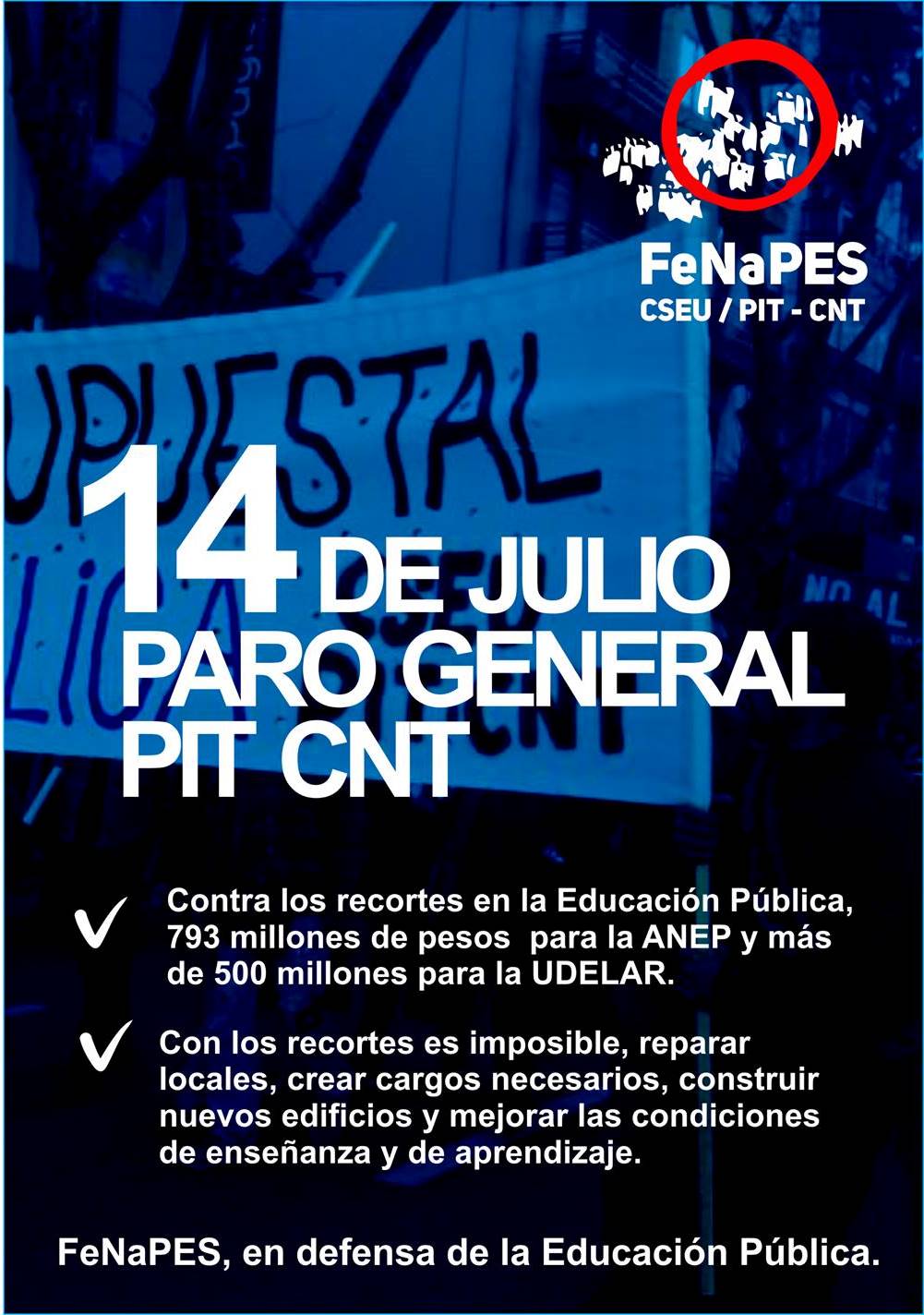 PIT-CNT 14 de Julio: Paro General de 24 horas del PIT-CNT. Contra los recortes en la Educación Pública julio 14, 2016
