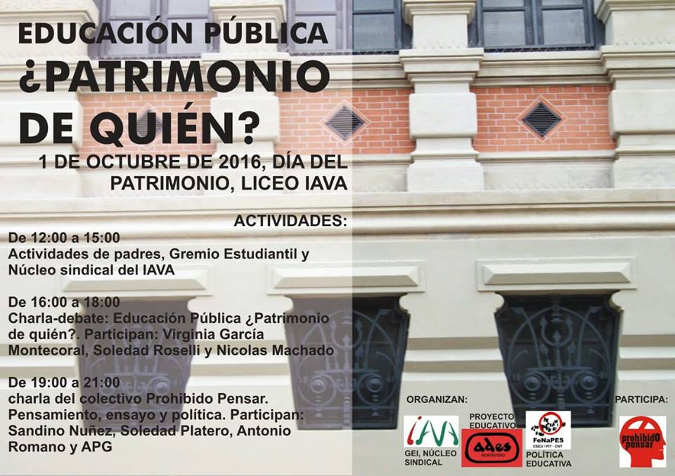 Proyecto Educativo Sábado 1° de Octubre: «Educación Pública, ¿patrimonio de quién?» Liceo IAVA septiembre 27, 2016