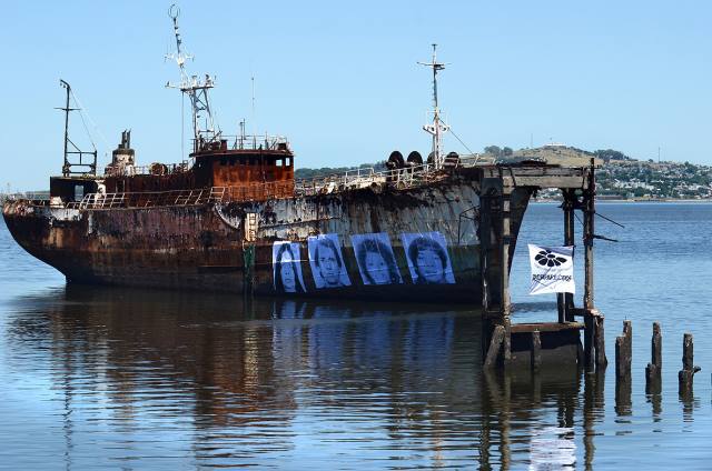 Una serie de retratos de uruguayos detenidos desaparecidos intervienen el casco de un barco abandonado en la bahía de Montevideo, como forma de denunciar el