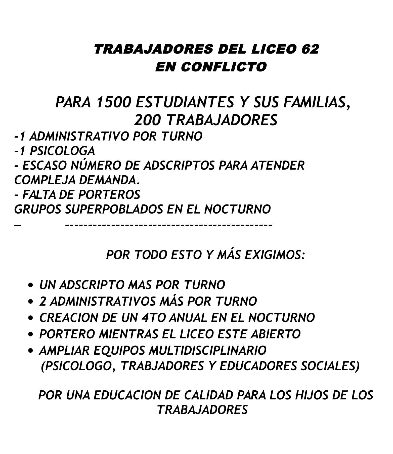Núcleo Sindical del Liceo 62 continúa sin respuesta del CES a sus reclamos y resuelve parar el viernes 26 de mayo