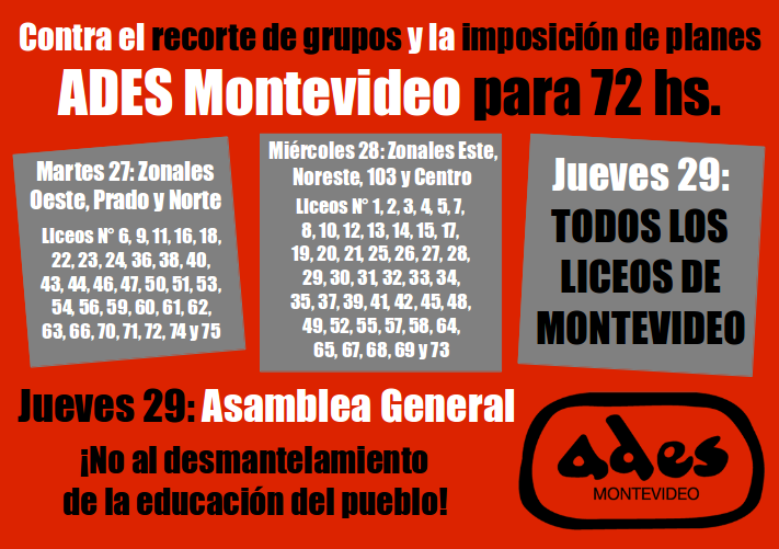 Paros Contra el recorte de grupos y la imposición de planes, ADES Montevideo para 72 hs. noviembre 24, 2018