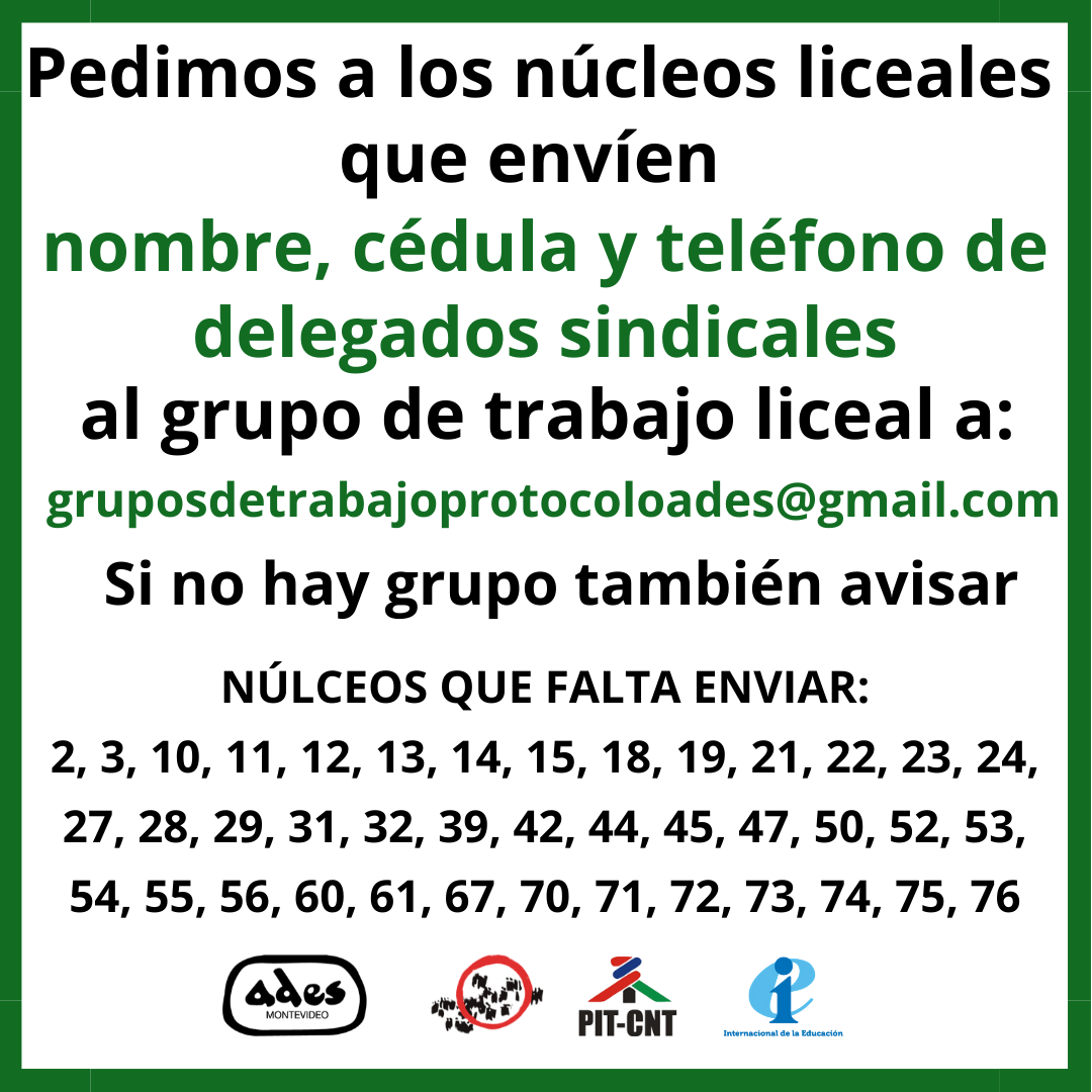 Comunicado de Comisión Directiva: Comunicado con el resumen de los documentos: Relevamiento de datos por liceo: Cuestionario para los núcleos: https://forms.gle/NgDdNQbDro9tmYkb7 Documentos citados: