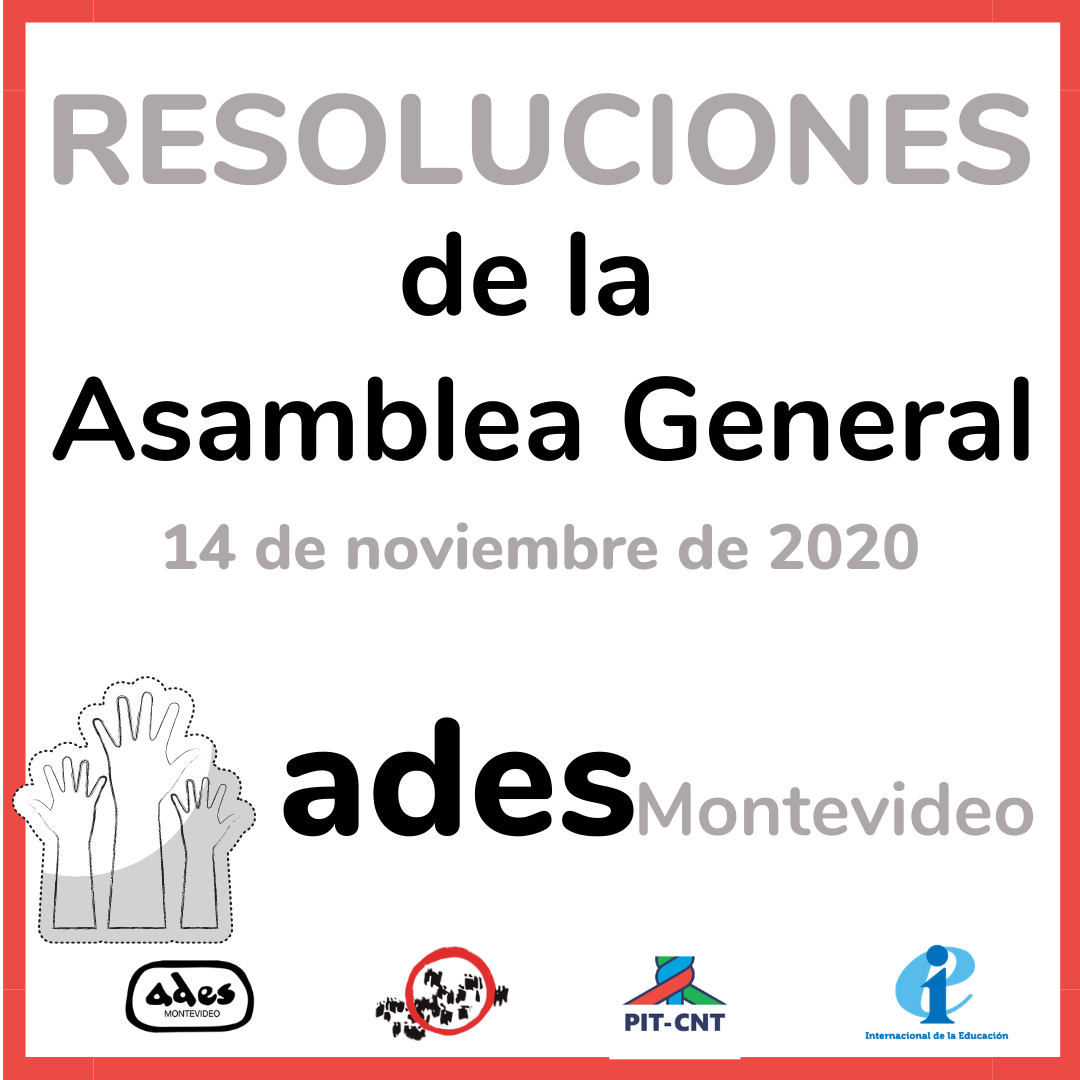 Mociones de Resolución de la Asamblea General del 14 de noviembre de 2020. ADES Montevideo. Moción 1) La asamblea de ADES Montevideo entiende que las