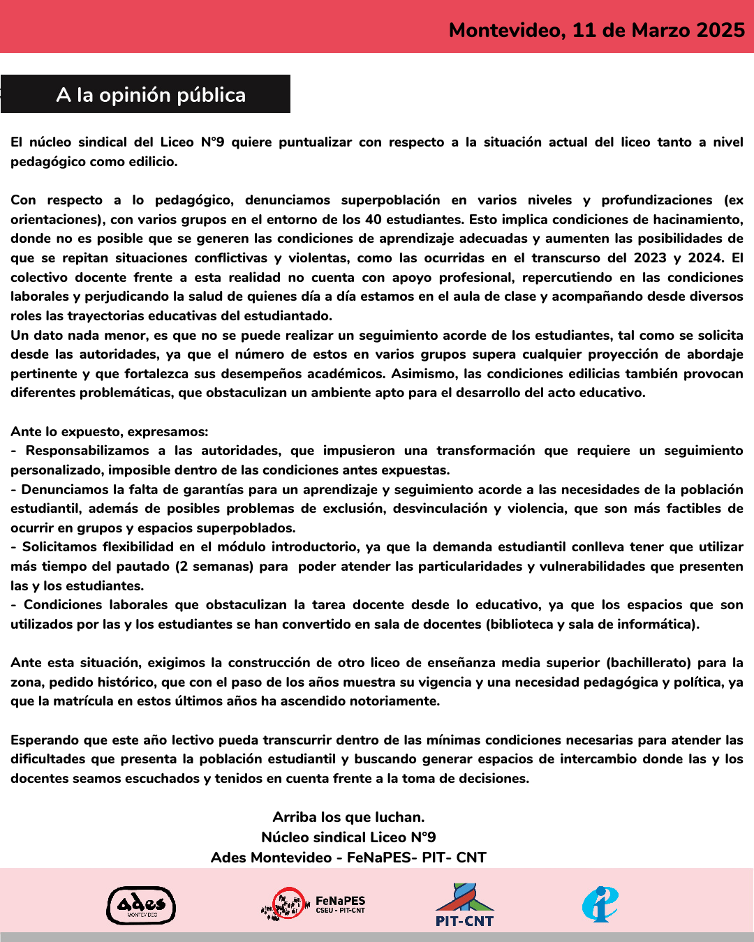 Montevideo, 11 de Marzo 2025 El núcleo sindical del Liceo N°9 quiere puntualizar con respecto a la situación actual del liceo tanto a nivel pedagógico