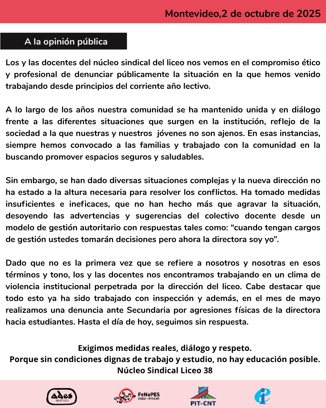 Montevideo,2 de octubre de 2025 Los y las docentes del núcleo sindical del liceo nos vemos en el compromiso ético y profesional de denunciar públicamente