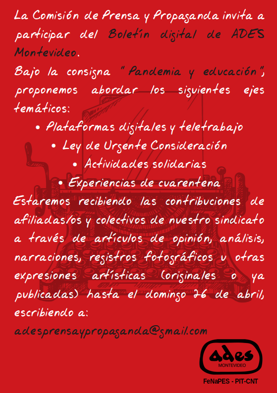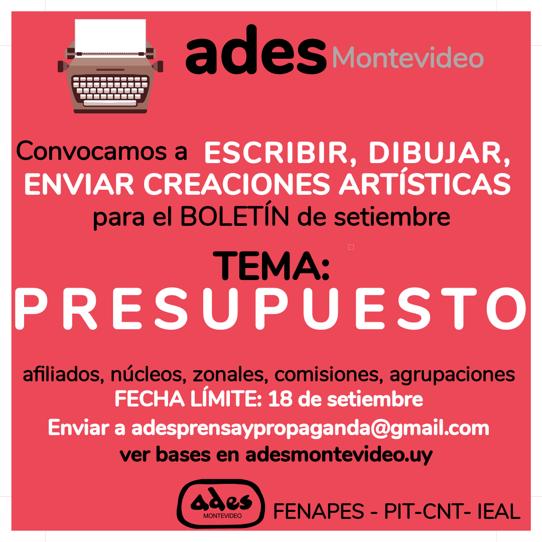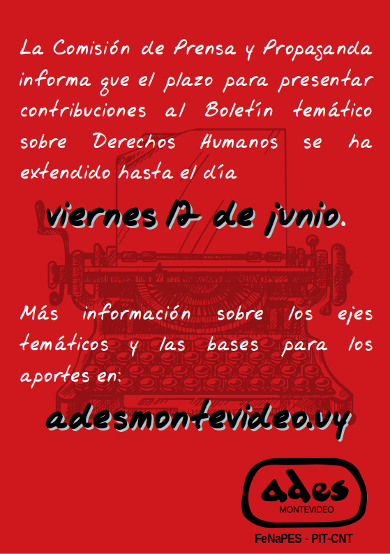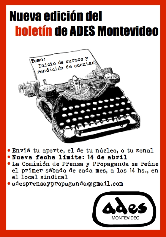 Compañeros: el plazo para la presentación de artículos a ser incluidos en el próximo boletín de ADES Montevideo vence el lunes 15 de agosto, a la