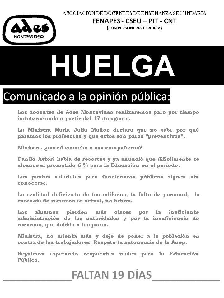 Descargar aquí versión PDF para imprimir del Comunicado de ADES Montevideo a 15 días del inicio de la huelga