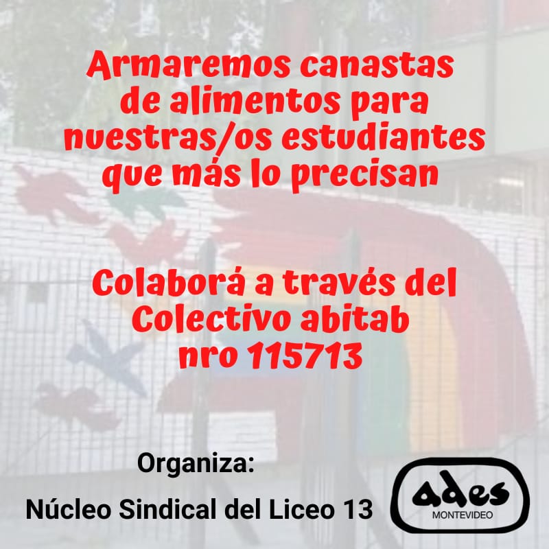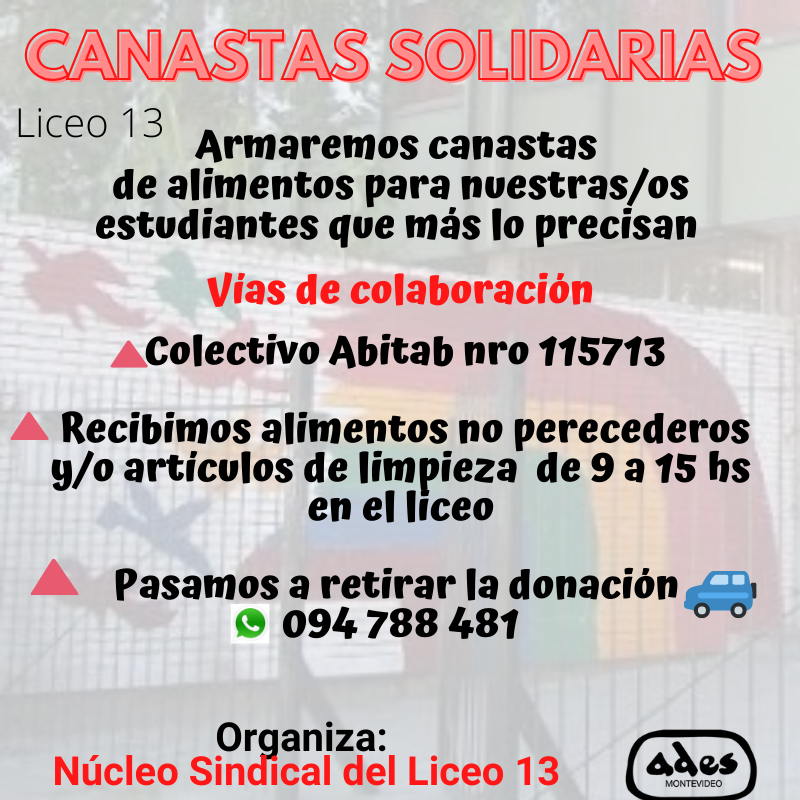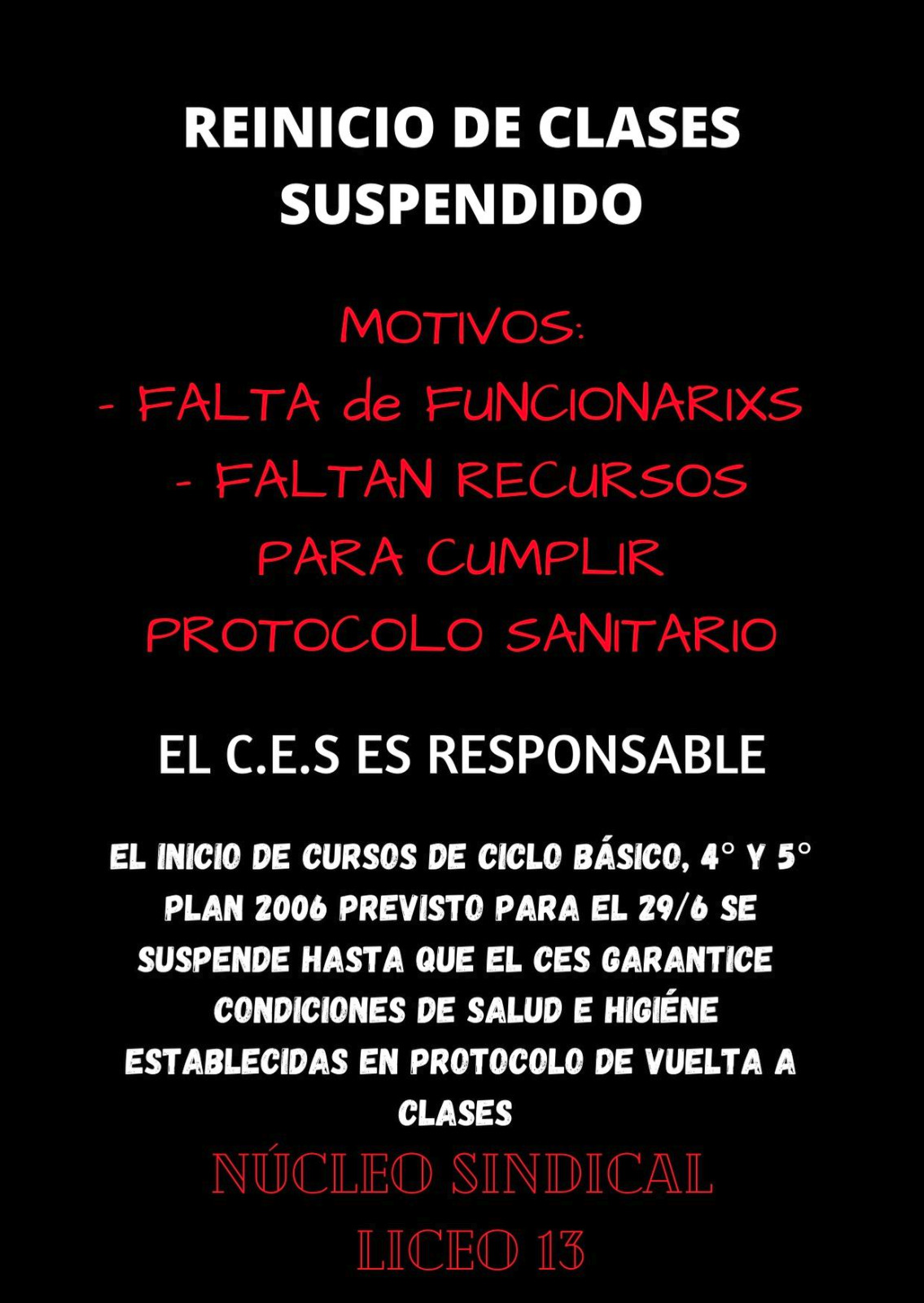 A la opinión pública: Desde el núcleo sindical del Liceo N° 13 deseamos expresar por este medio que no obtuvimos por parte del CES ningún tipo