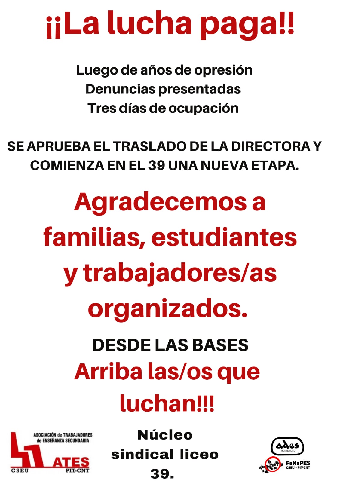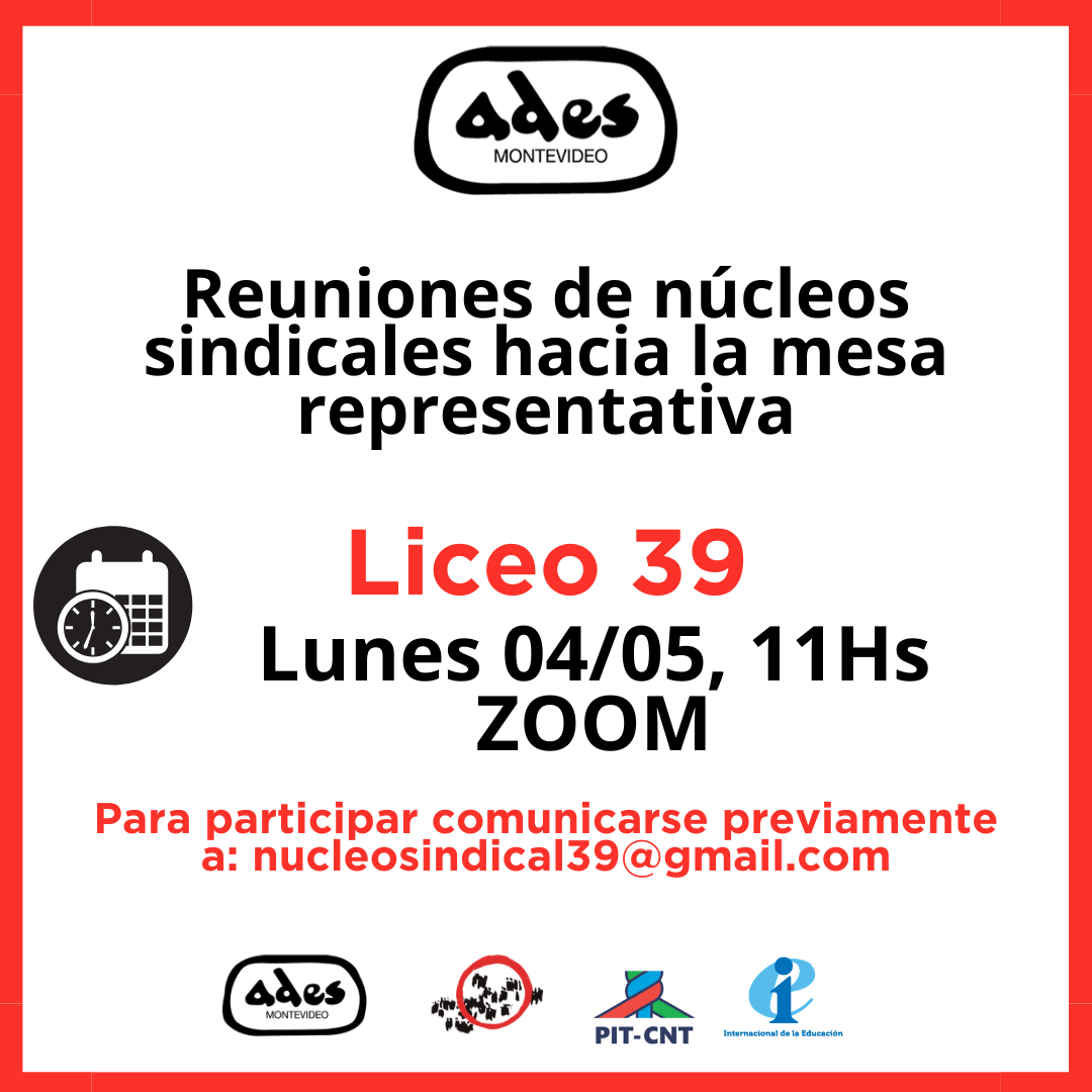 Montevideo, 28 agosto 2019. A la opinión pública: El núcleo sindical del liceo N°39 de Montevideo comunica y denuncia mediante la presente nota la situación