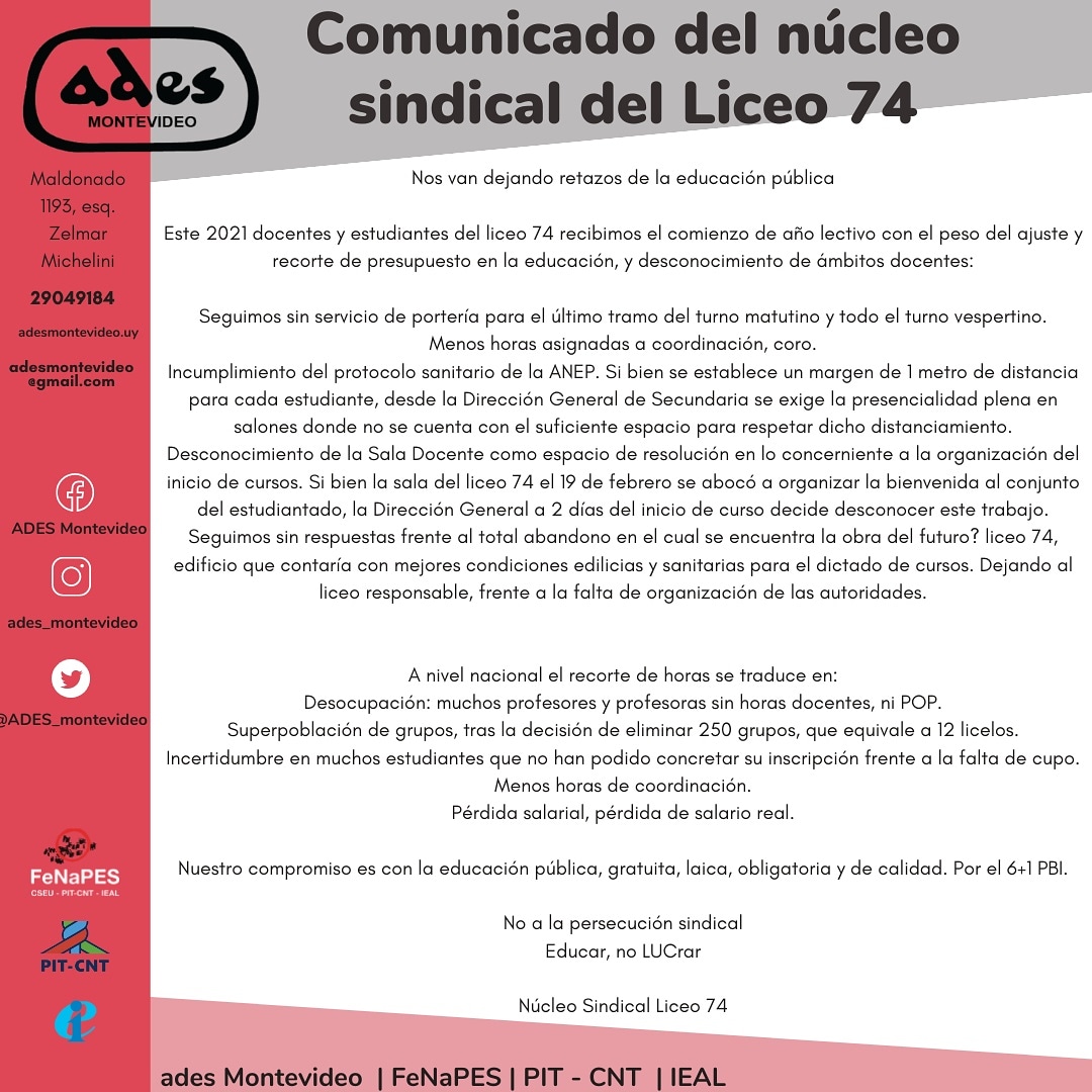 El núcleo sindical de ADES, ATES y funcionarios del Liceo 74 queremos expresar lo siguiente: La situación que vive la educación pública y nuestro liceo