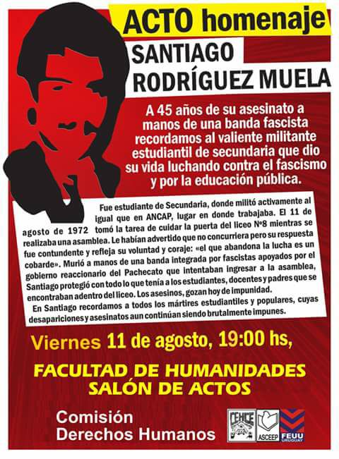 Compañeros de ADES Montevideo: Por la presente queremos hacerlos partícipes de la actividad homenaje al estudiante y trabajador Santiago Rodríguez Muela a 45 años de