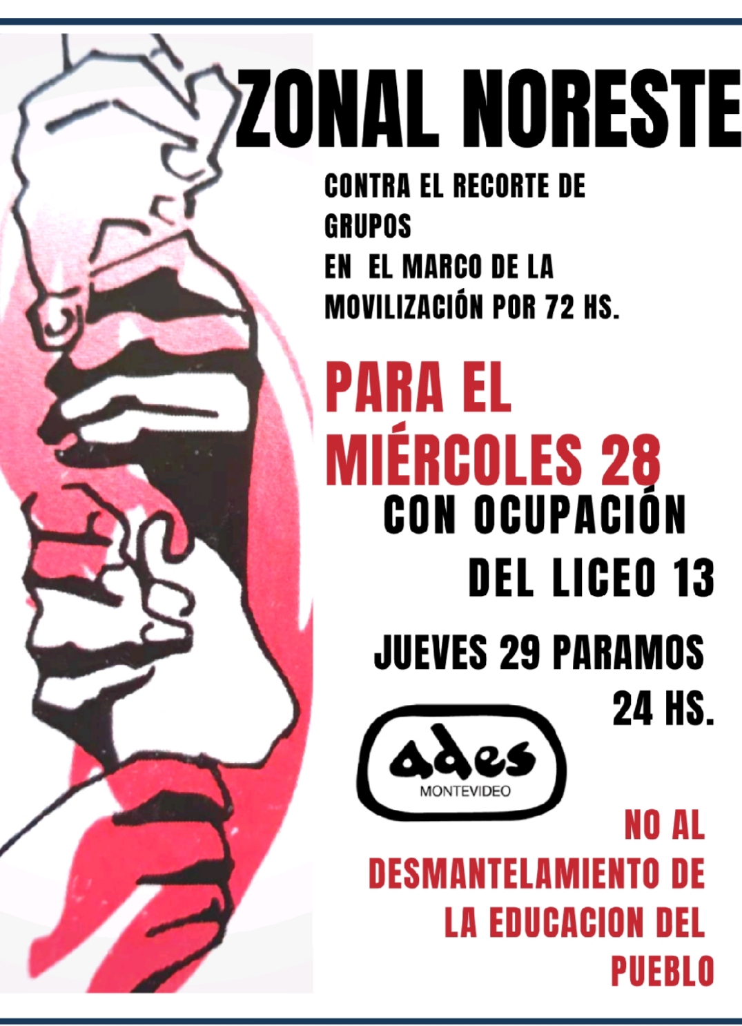 El Zonal Oeste de ADES Montevideo para 24 hs. y ocupa el Liceo N° 22 de La Teja, el martes 28 de noviembre. Reclamamos: No