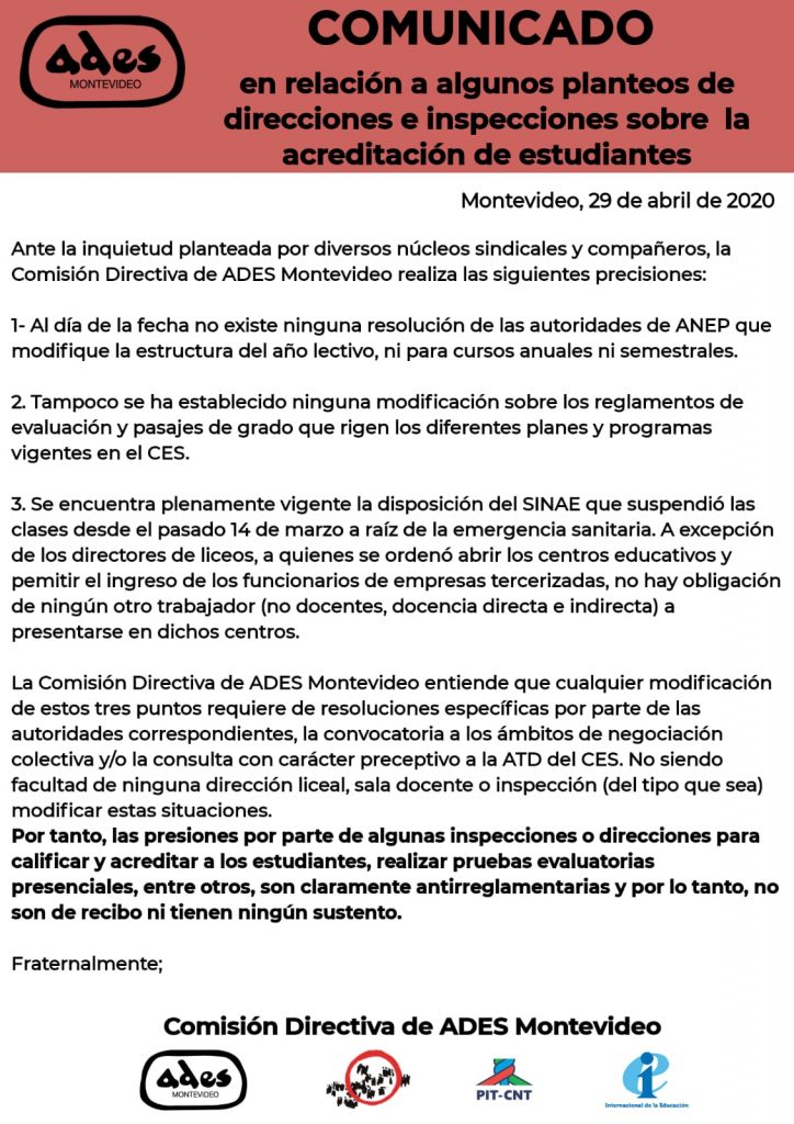 Comunicado de la comisión Directiva de Ades-Montevideo
