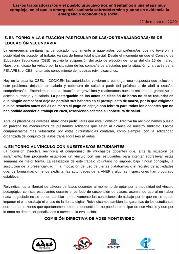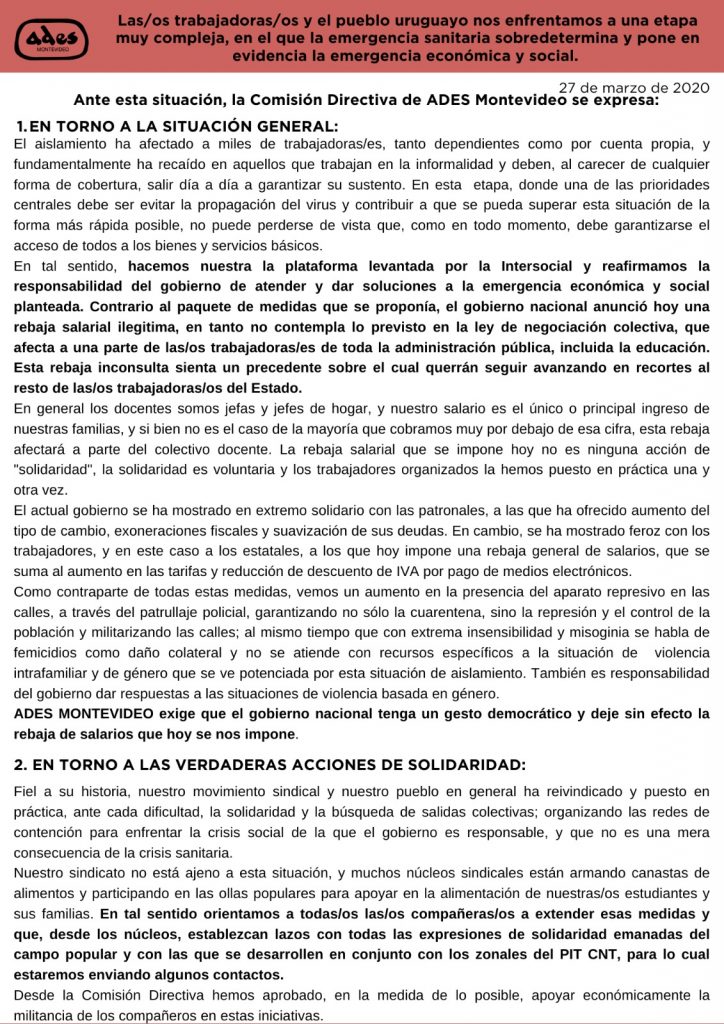 Comunicado de la COMISIÓN DIRECTIVA de ADES Montevideo frente a la etapa compleja que estamos atravesando
