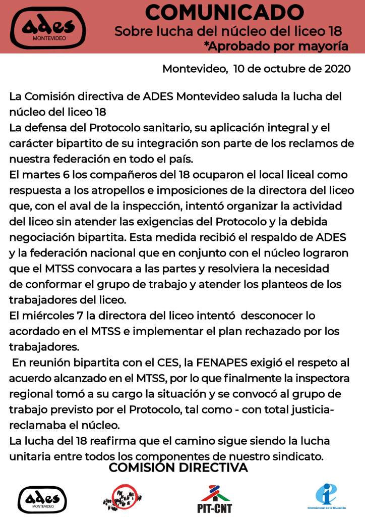 Comunicado de la comisión directiva sobre lucha del núcleo del liceo 18