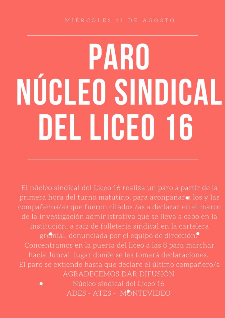 Comunicado del Núcleo Sindical del Liceo Nº16