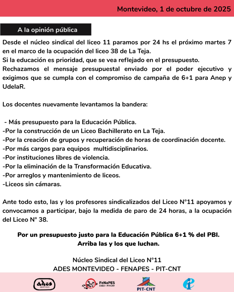 Desde el núcleo sindical del liceo 11 paramos por 24 hs el próximo martes 7 en el marco de la ocupación del liceo 38 de La Teja.