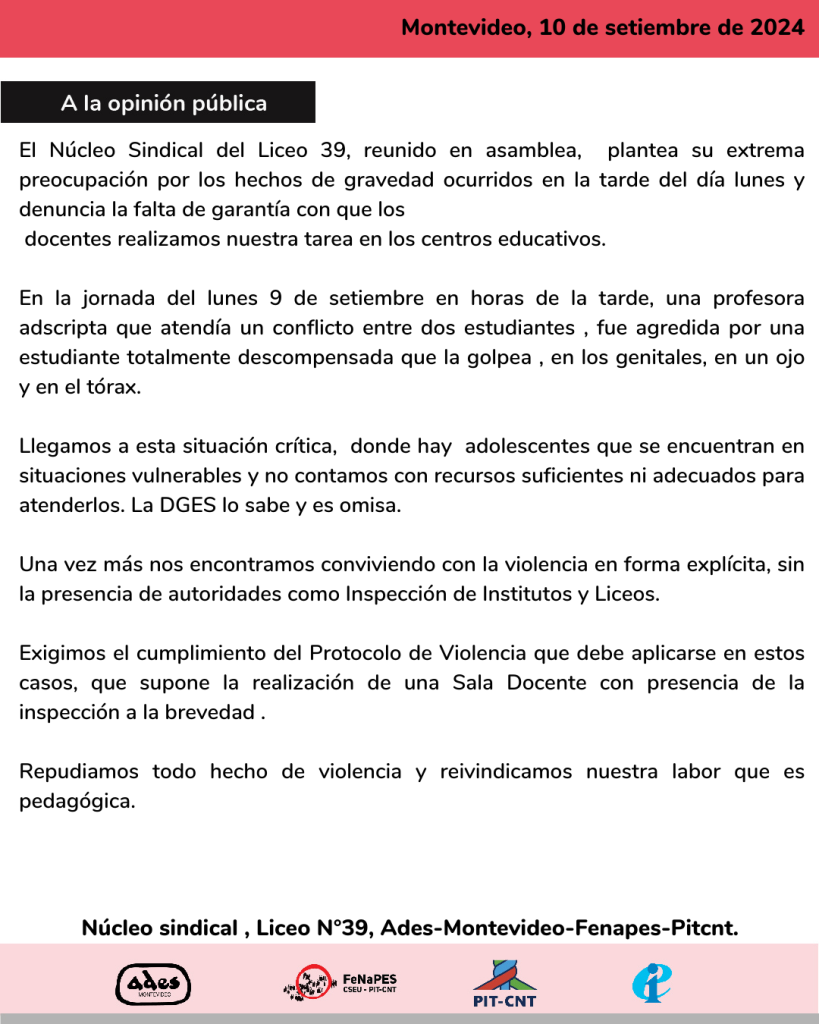 El Núcleo Sindical del Liceo 39, reunido en asamblea, plantea su extrema preocupación por los hechos de gravedad ocurridos en la tarde del día lunes y denuncia la falta de garantía con que los