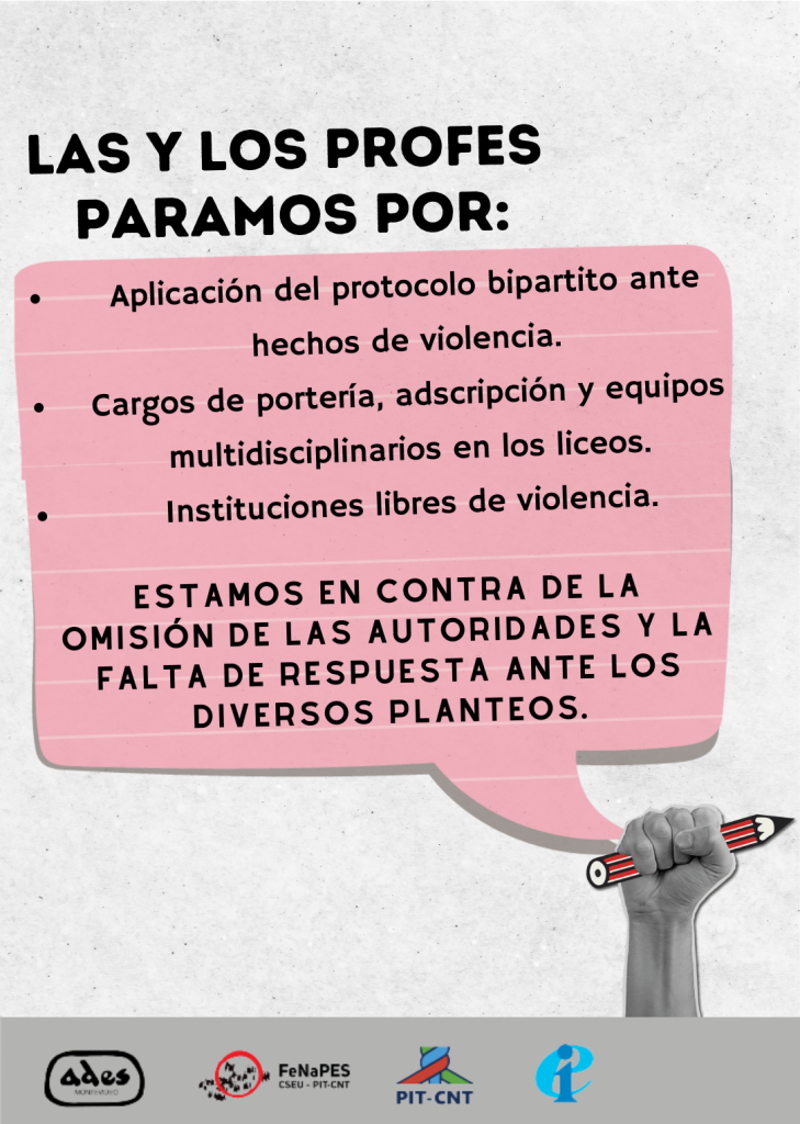 Hemos reclamado la presencia de inspecciones en los liceos para abordar estas situaciones e intentar prevenirlas de manera conjunta, cosa que no ha sucedido. Las autoridades desconocen la organización sindical y a los colectivos docentes en general que en salas y coordinaciones docentes plantean las mismas preocupaciones. En este sentido, se le solicitó a la DGES una instancia inmediata de trabajo sobre el tema; y al CODICEN de la ANEP una mesa de trabajo interinstitucional que nos incluya, pero donde también incluir a otros actores como ser referentes, académicos, familias. La respuesta ha sido omisa, recién luego de definir el paro de mañana las autoridades convocan a una primera instancia bipartita con el CODICEN.