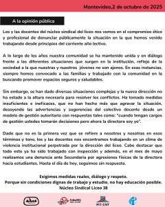 - El 26/7 el Núcleo del liceo 38 denunció públicamente una situación de violencia extrema en la entrada del liceo, situación que venía siendo reiterada y profundizada en los niveles de violencia.