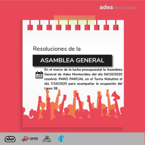 En el día de la fecha la Comisión Directiva de ADES Montevideo resolvió realizar un paro de 24hs el día 13 de setiembre del presente, como medida de denuncia ante las reiteradas situaciones de violencia vividas en centros educativos sobre las cuales no hemos tenido respuesta de las autoridades.
