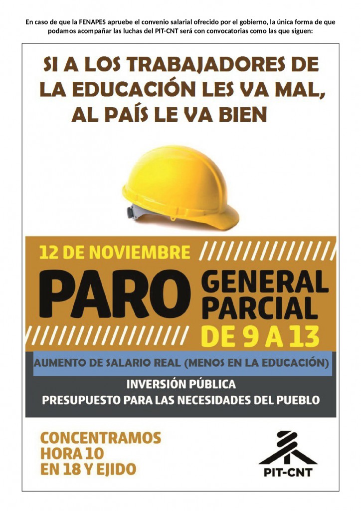 En caso de que la FENAPES apruebe el convenio salarial ofrecido por el gobierno, la única forma de que podamos acompañar la lucha del PIT-CNT será con convocatorias como las que encabezan y cierran estas notas.