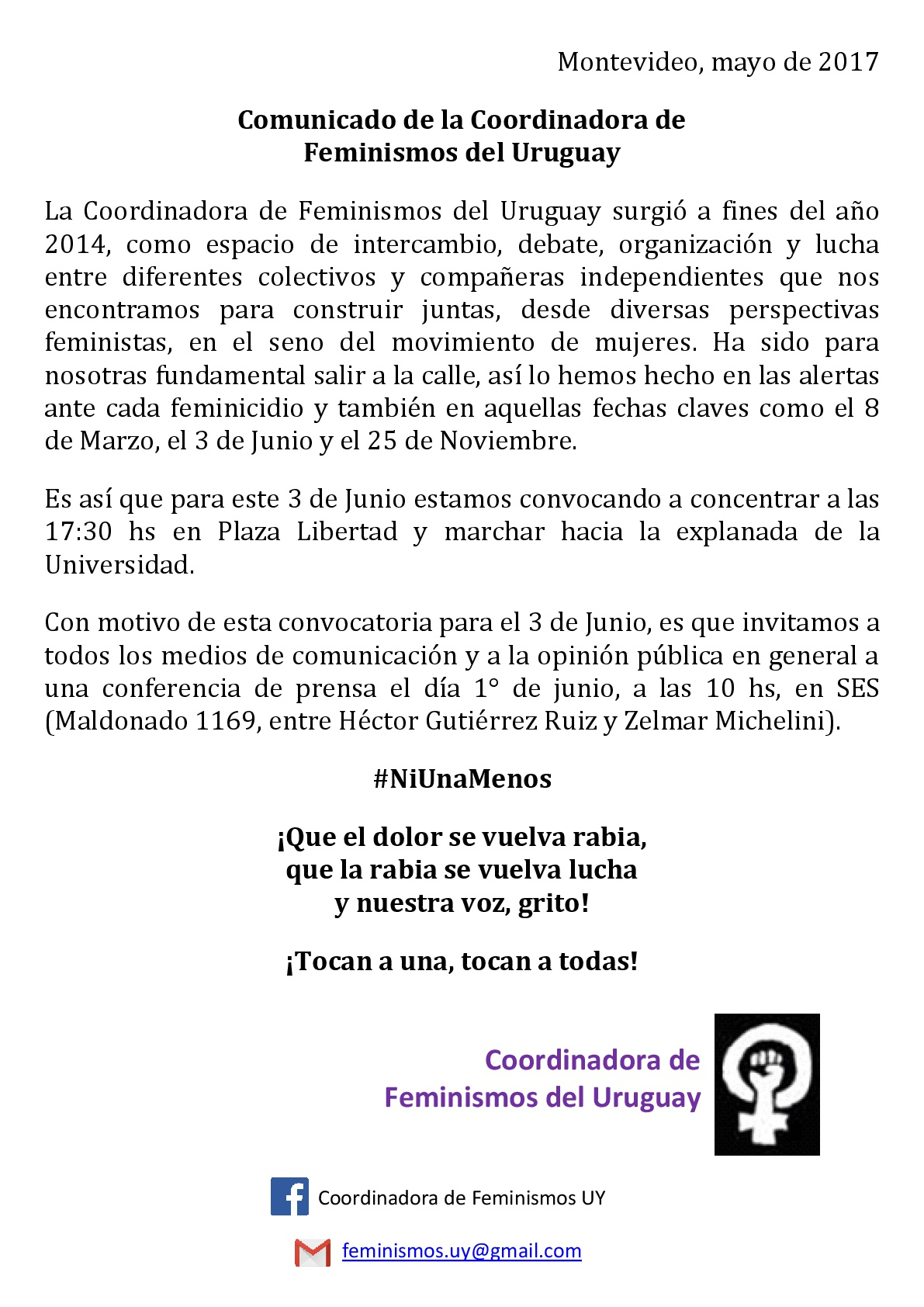 Marcha de la Coordinadora de Feminismos del Uruguay: Sábado 3, Hora 17:30. Plaza Libertad