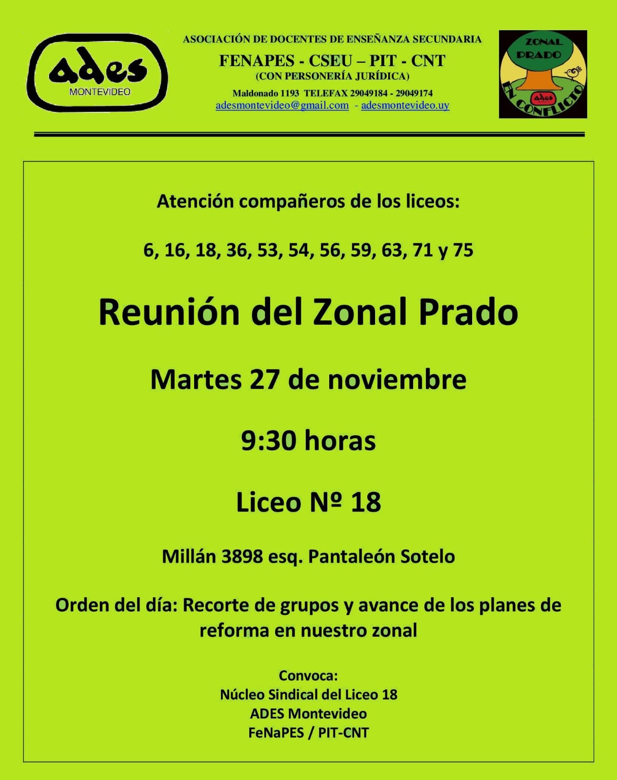 Reunido en asamblea ADES Montevideo-ATES, el Núcleo Sindical del Liceo N° 18 resuelve, en el marco del paro zonal aprobado en Asamblea General, ocupar el día de mañana, martes 27 de noviembre, y convocar a reunión del Zonal Prado a la hora 9:30.