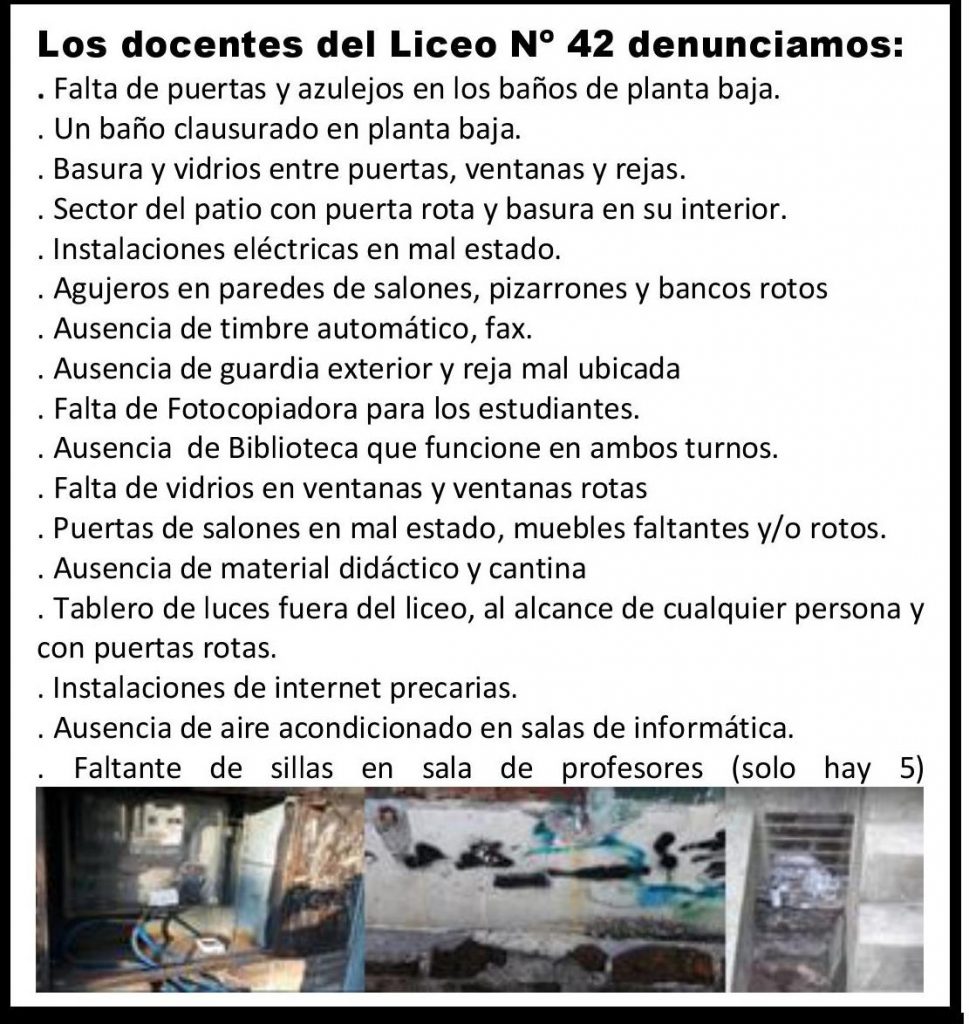 Núcleo Sindical del Liceo 42 reitera denuncias y falta de respuestas del CES