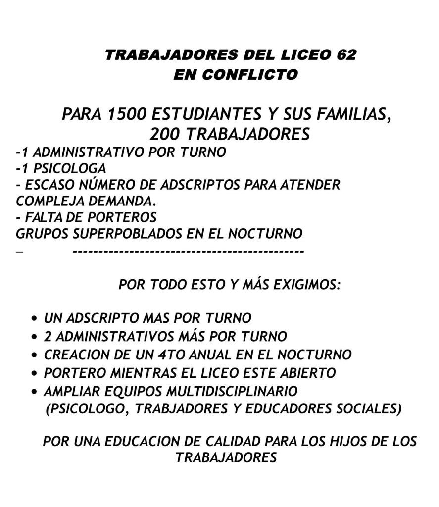 En el día de la fecha y dentro del marco de los paros determinados por FENAPES, el núcleo del Liceo 62, resuelve realizar un paro activo el día Viernes 26 de Mayo. La medida fue tomada luego de continuar sin respuesta a los reclamos expuestos al Consejo en fecha 21 de Abril de 2017.